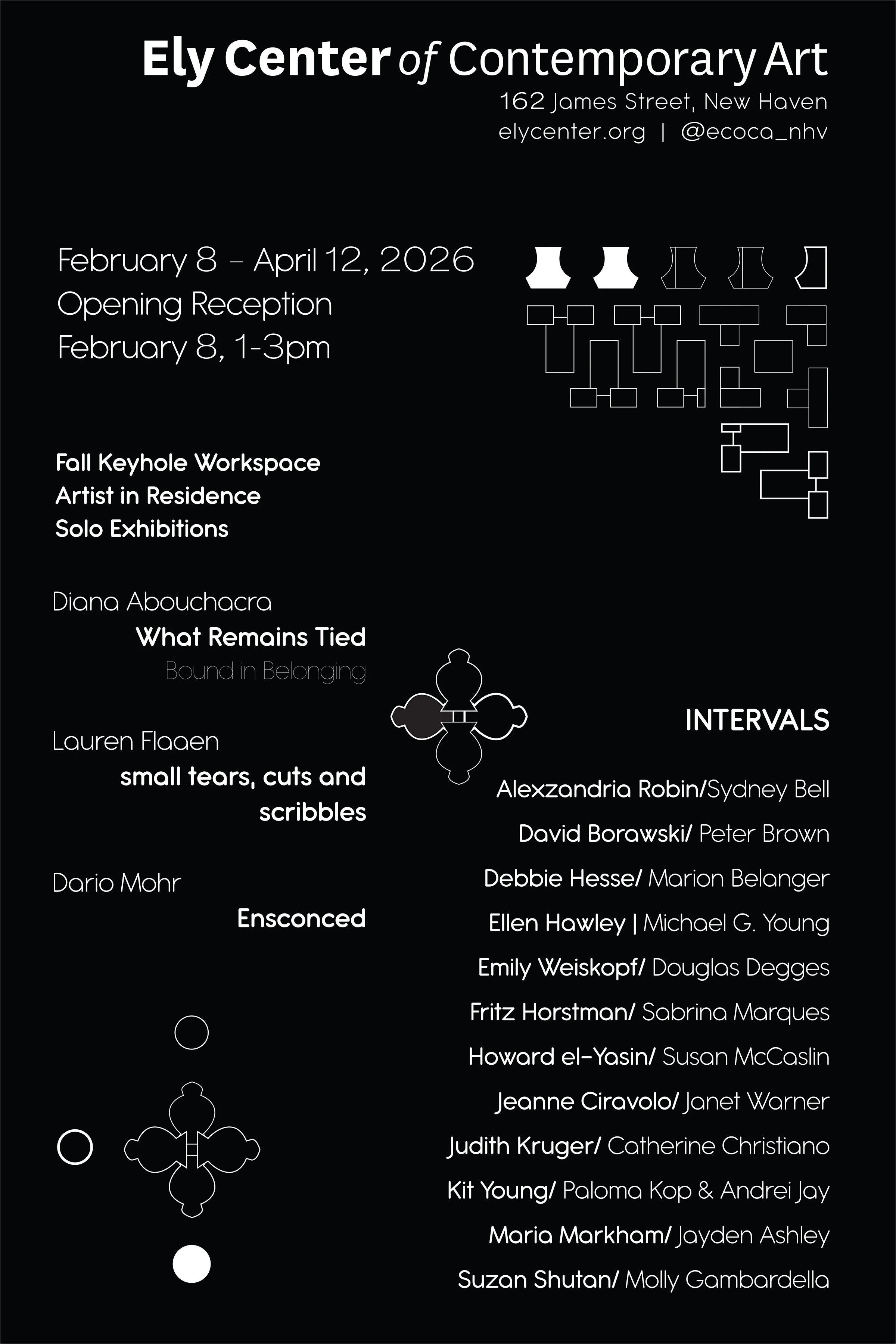 Intervals mark both pauses and beginnings. Presented by the volunteer artists and curators who make up Ely Center’s Curatorial and Program Advisory Committee, this group exhibition reflects on the spaces between places and moments of change. This invitational exhibition, where our incumbent committee invited artists to join them, responds to another interval, a temporary relocation of our gallery.